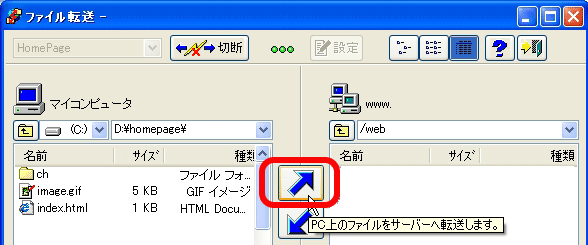 ローカル側ウィンドウ内の転送したいファイルを選択して[右上向き矢印]ボタンをクリックしてください。