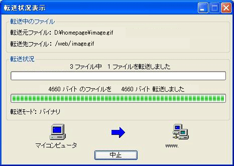 イメージファイル(.gif.jpg)等は、「バイナリ転送モード」でアップロードを行わないと、インターネット上で表示されなくなってしまいます。通常は「自動切り替えモード」を選択しておいてください。