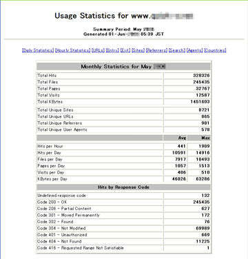 Hits, Files, Pages, Visits, Sites, KBytesが報告されます。
