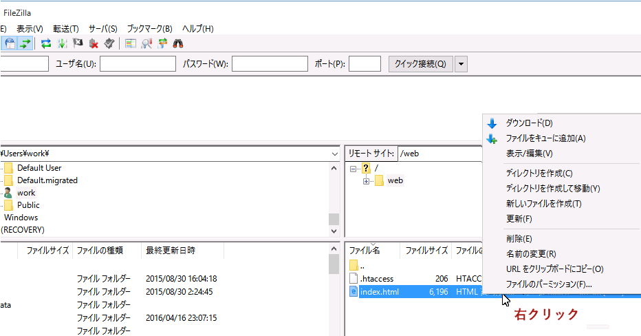 ファイルを選択して、右クリックすると、パーミッションの変更など、FTPの各種の操作が可能です。