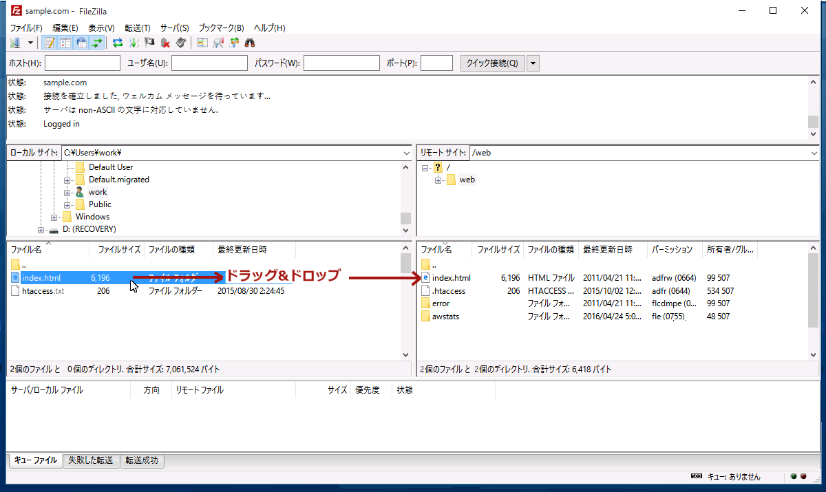 ※FileZilla 以外のパソコンの画面から、ファイルをドラッグ&ドロップしてアップロードすることもできます。