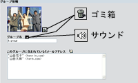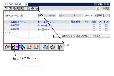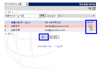 アドレス帳が表示されますので、このグループに登録したいメンバーをチェックして、完了ボタンを押してください。 |