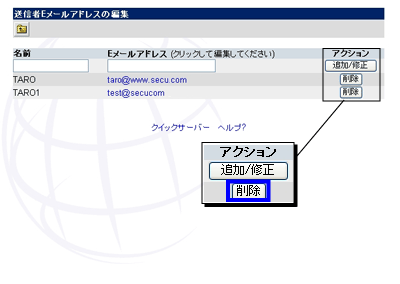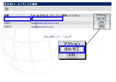 編集するメールアドレスをクリックし、 修正したあと、。 『追加/修正』ボタンをクリックして下さい。 |