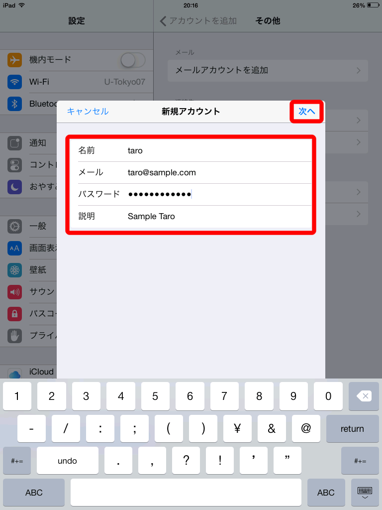下の表を参考にして、必要事項を入力し「次へ」を選択します。