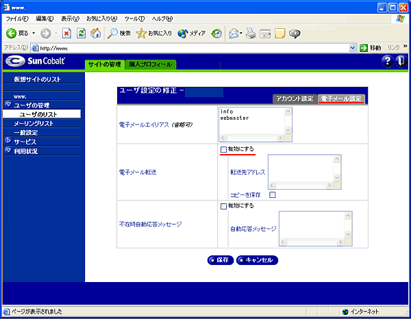 エイリアスは、ユーザー名が作成できな場合、同じユーザーで複数のメールアドレスを設定したい場合などにご利用下さい。 |