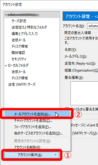 すでに thunderbird をお使いの場合は、アカウント設定の画面から