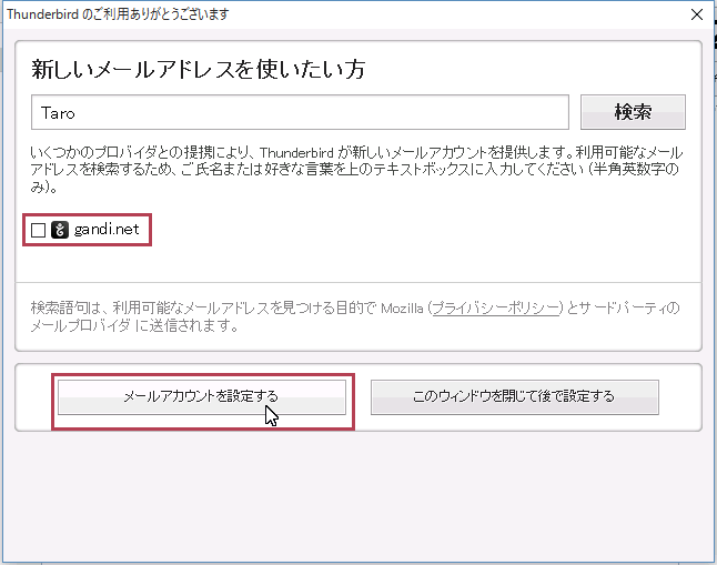 gandi.netのチェックは外し、「メールアカウントを設定する」を選択。